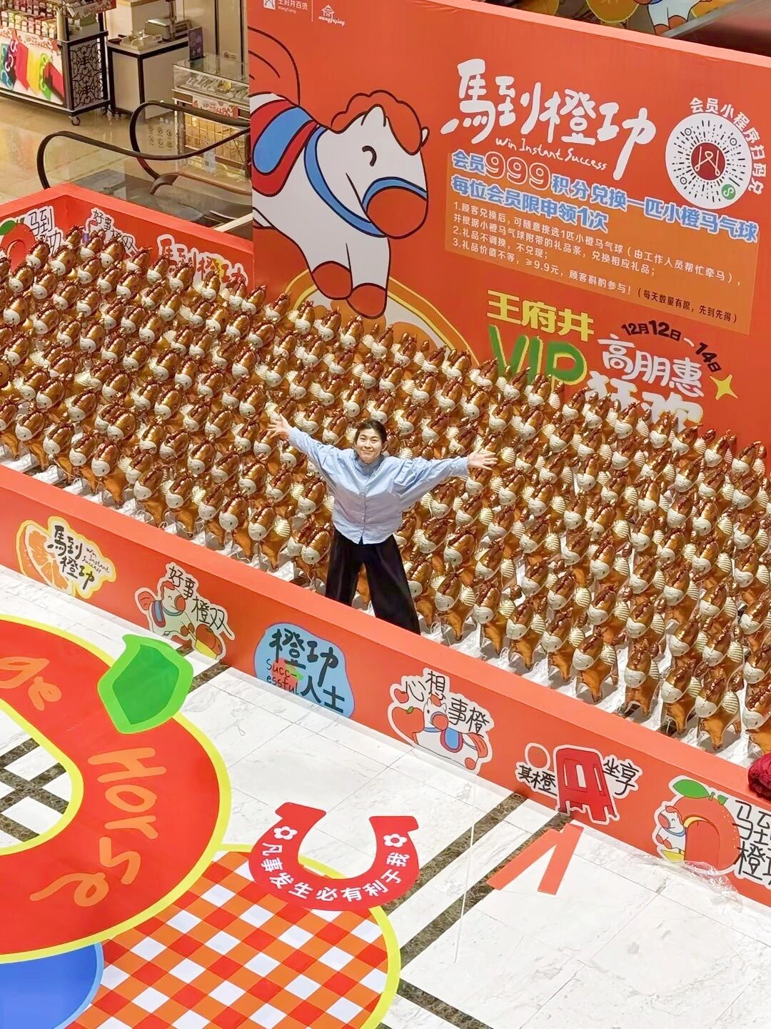 活动期间,会员仅需1积分即可线上兑换“真橙伴手礼”,这份限量1000份的好礼承载“心想事成”的祝福,用微小而确定的仪式感,强化会员的情感归属。一层中庭打造“橙市”欢乐场,游戏化互动引爆现场热度:会员消耗999积分即可牵走一匹藏有奖券的“小橙马气球”;消费满额即可参与积分大转盘,将会员积分价值可视化、游戏化;每日下午热门IP人偶定时巡游与顾客亲密互动并派发小礼品,吸引家庭客群,创造亲子欢乐记忆。
