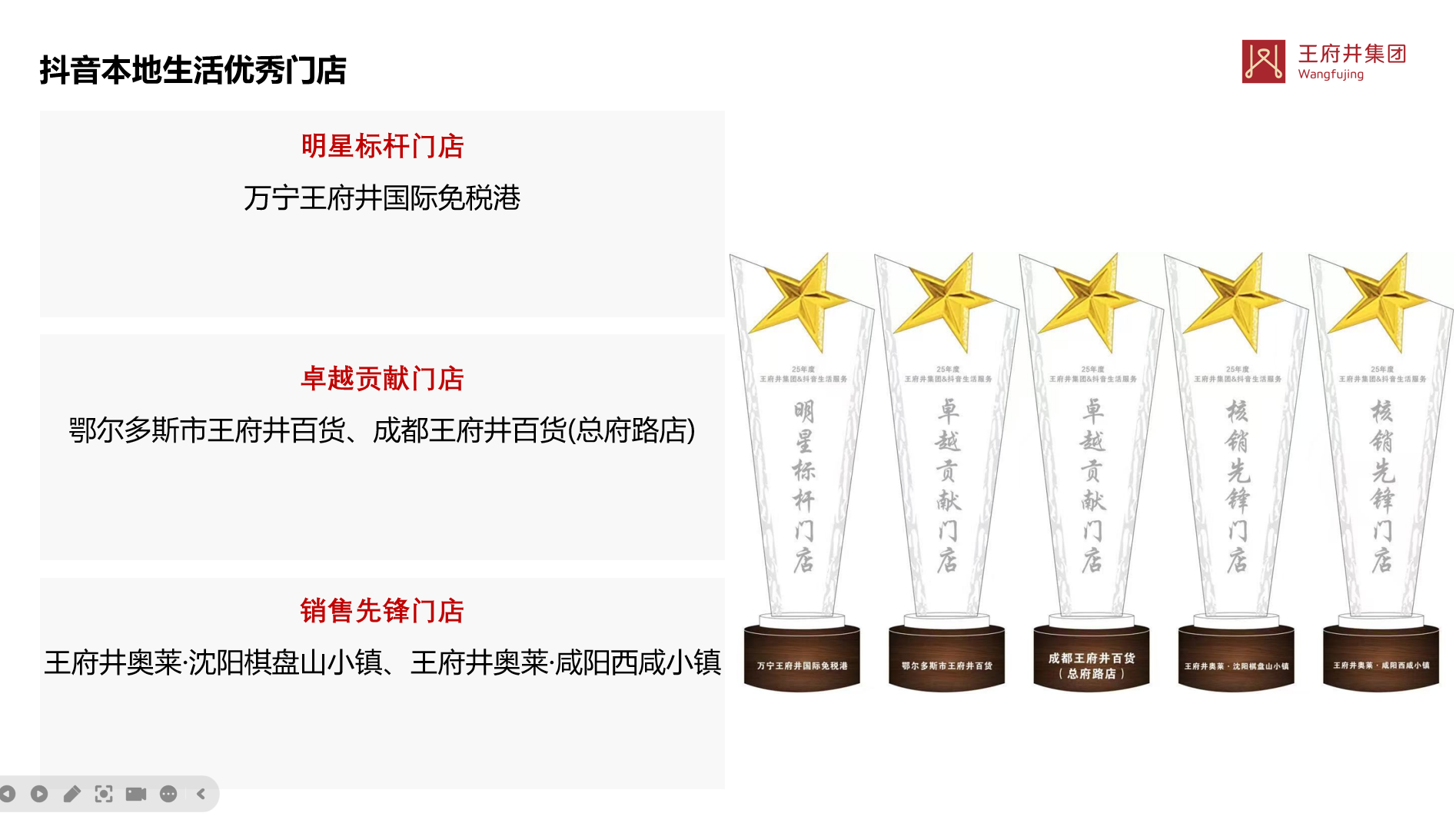 集团总裁助理、市场与数字运营中心总经理杜涛解读2025年度集团抖音平台整体业务概况,从平台特点、行业规模、各门店业绩贡献等维度出发,系统梳理了过去一年抖音平台电商及本地生活销售、曝光等方面的行业规模,剖析当前业务发展面临的机遇与挑。同时对2025年在抖音平台做出优秀业绩的门店:万宁王府井国际免税港、鄂尔多斯市店、成都店、沈阳棋盘山小镇、咸阳西咸小镇进行表扬。