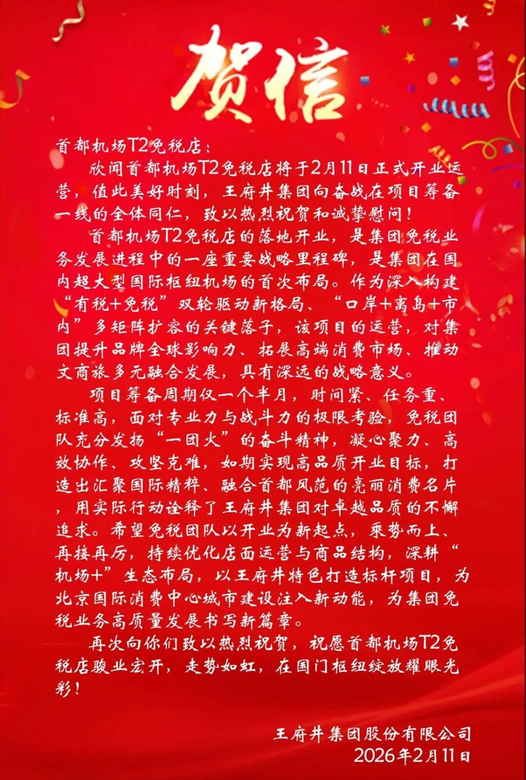 首旅集团总会计师孙福清,王府井集团党委书记、副董事长、总经理尚喜平,王府井集团副总经理、王府井免税总经理胡勇,北京首都国际机场股份有限公司财务总监李志勇,北京首都国际机场股份有限公司董事会秘书、商业开发部总经理李博,北京首都机场商贸有限公司党委书记华民涛出席揭牌仪式,与会嘉宾手持红绸,共同见证王府井免税首都机场T2免税店正式投入运营,并祝新店未来蒸蒸日上。作为深入构建集团“有税+免税”双轮驱动新格局、“口岸+离岛+市内”多矩阵扩容的关键落子,王府井免税首都机场店对王府井集团提升品牌影响力、拓展高端消费市场、推动文商旅多元融合发展,具有深远的战略意义。