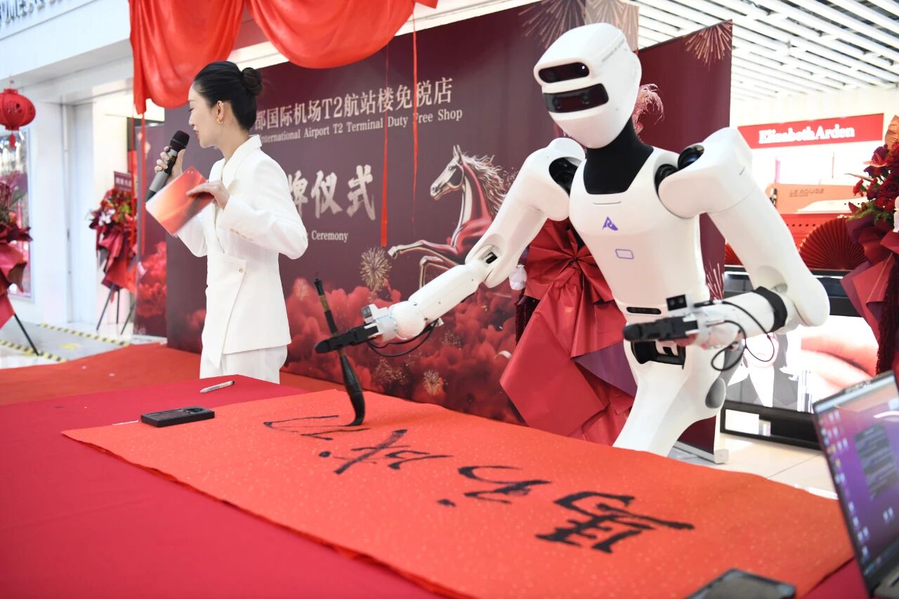揭牌仪式上,王府井免税带来了新颖的机器人互动拜年、舞蹈暖场和书法创作等表演环节,为首都机场T2航站楼免税店开业送上“马到成功”的祝福。