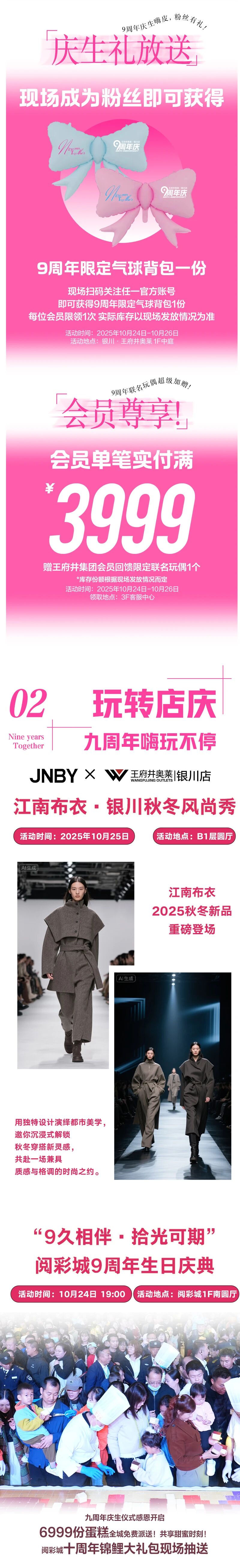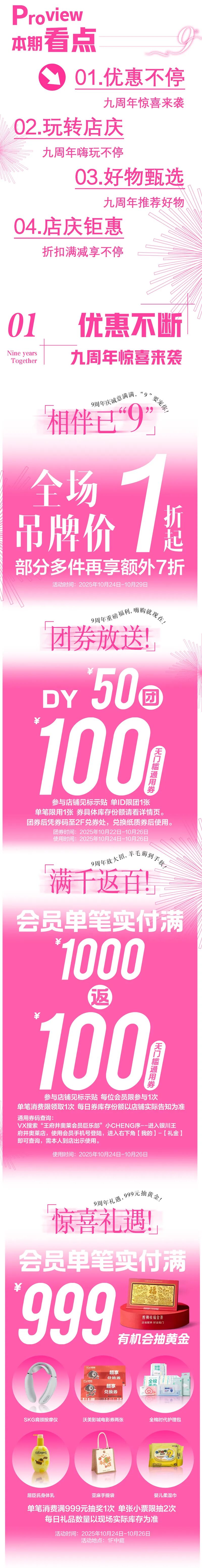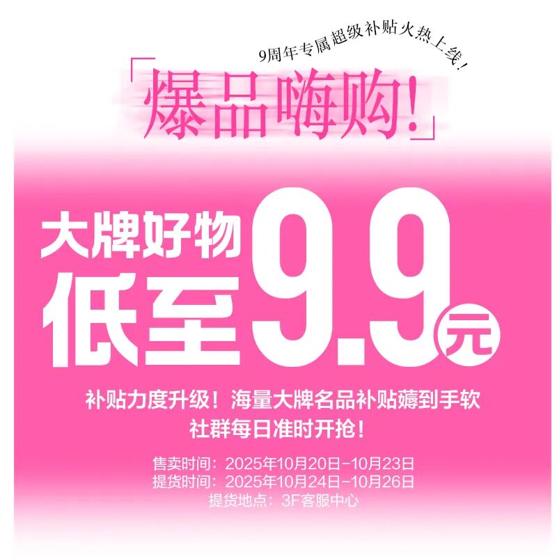 重磅来袭!9周年店庆→满千返百、50团100、满999抽黄金、积分限时抵现、补贴升级大牌低至9.9!时尚大秀、音乐节等你来打卡